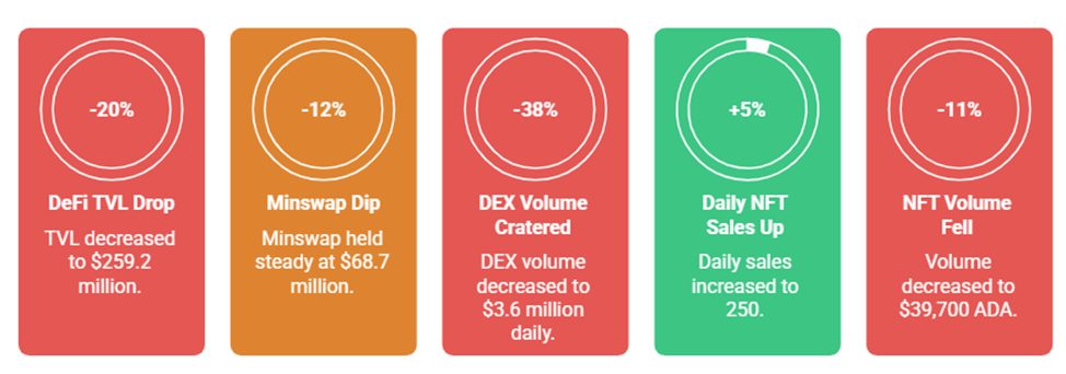 Stablecoin và các dApp như công cụ bỏ phiếu AI của SyncAI, trò chơi của Goldmine Arcade, và kế hoạch stablecoin riêng tư của Open Djed cho thấy sự tăng trưởng theo ngách nhưng nhìn chung hoạt động kém của hệ sinh thái so với các đối thủ cạnh tranh như Solana hoặc Ethereum nhấn mạnh sự cần thiết phải thu hút người dùng nhanh hơn.