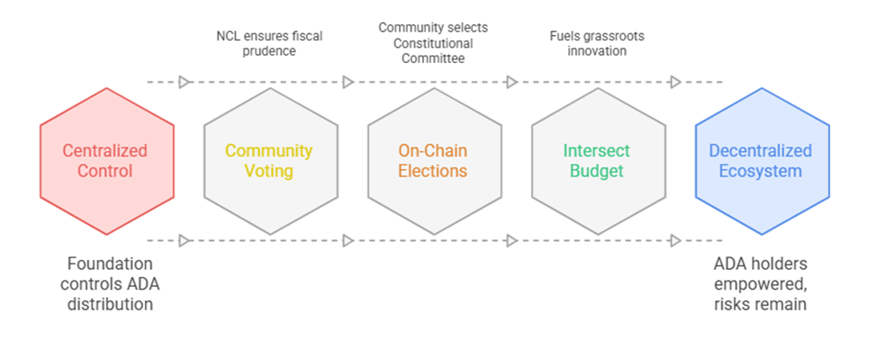 Ngân sách được Intersect phê duyệt 15 triệu ADA cho Builders DAO mới và 60 triệu cho các vòng Project Catalyst đã thúc đẩy đổi mới cấp cơ sở. Khi Cardano Foundation, IOG, Intersect và EMURGO giảm dần quyền kiểm soát trực tiếp, sự thay đổi này trao quyền cho những người nắm giữ ADA nhưng cũng giới thiệu rủi ro phối hợp trong một hệ thống còn non trẻ.