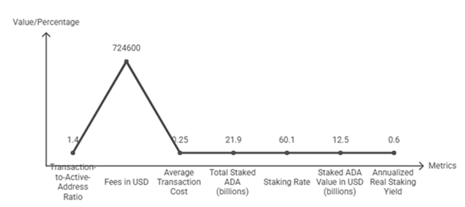 Staking, một nền tảng của mô hình bằng chứng cổ phần (proof-of-stake) của Cardano, cho thấy sự kiên cường: tổng số ADA được stake tăng nhẹ 0,78% lên 21,9 tỷ, đẩy tỷ lệ staking lên 60,1%. Tuy nhiên, về mặt giá trị USD, nó giảm 12,8% xuống còn 12,5 tỷ đô la do sự yếu kém về giá của ADA. Lợi suất staking thực tế hàng năm giữ ổn định ở mức 0,6%, phù hợp với lạm phát khi dự trữ tiến gần đến mức giới hạn cung cấp 45 tỷ ADA.