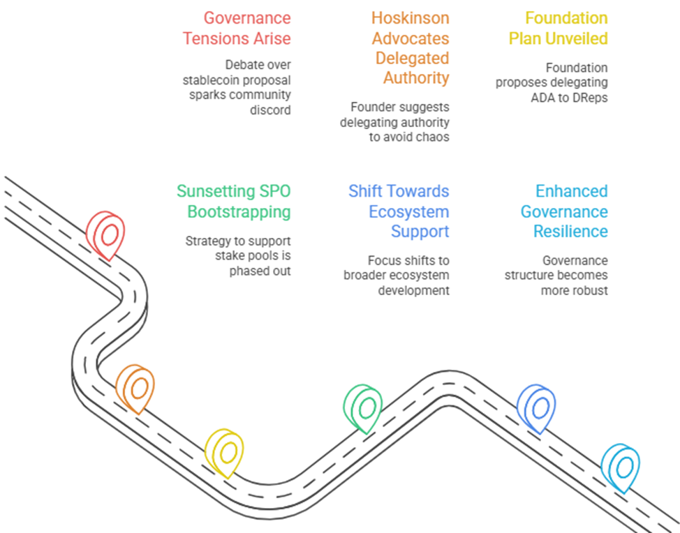Lộ trình này phản ứng với những căng thẳng quản trị gần đây trong cộng đồng Cardano, được châm ngòi bởi một cuộc tranh luận vào ngày 21 tháng 9 năm 2025 về một đề xuất thanh khoản stablecoin 50 triệu ADA. Cuộc thảo luận làm nổi bật sự khác biệt trong triết lý ra quyết định: Người sáng lập Charles Hoskinson ủng hộ quyền hạn được ủy quyền để tránh những cạm bẫy của nền dân chủ trực tiếp hỗn loạn. Theo quan điểm này, kế hoạch của Cardano Foundation bao gồm việc ủy quyền thêm ADA cho các DReps và chấm dứt chiến lược khởi động nhà điều hành pool cổ phần (SPO), một mô hình đã hỗ trợ gần 400 pool trong hơn năm năm. Những động thái này báo hiệu một sự thay đổi hướng tới hỗ trợ hệ sinh thái rộng hơn và quản trị kiên cường hơn khi Cardano trưởng thành.