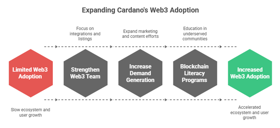 Lộ trình của CardanoFoundation nhấn mạnh việc mở rộng các nỗ lực áp dụng Web3 và dấu ấn toàn cầu. CardanoFoundation có kế hoạch củng cố đội ngũ áp dụng Web3 của mình, tập trung vào các tích hợp, niêm yết trên sàn giao dịch và phát triển RWA. Những nỗ lực này bổ sung cho các sáng kiến rộng lớn hơn, bao gồm các chương trình phổ cập kiến thức blockchain tại các khu ổ chuột ở Rio de Janeiro, nhấn mạnh cam kết của Cardano đối với khả năng tiếp cận, giáo dục và phân cấp.