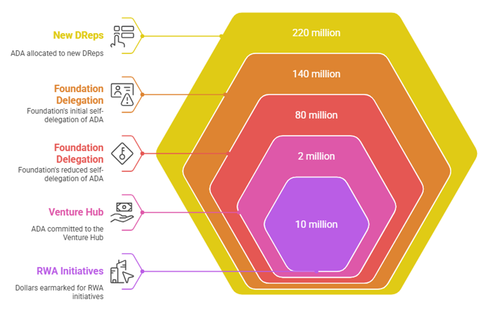 Lộ trình cũng phân bổ 220 triệu ADA cho các Đại diện được ủy quyền (DReps) mới, mở rộng quản trị phi tập trung đồng thời giảm sự tự ủy quyền của Foundation từ 140 triệu xuống còn 80 triệu ADA. Sự thay đổi này được thiết kế để trao quyền cho cộng đồng Cardano và thúc đẩy sự tham gia rộng rãi hơn vào các quyết định quản trị.